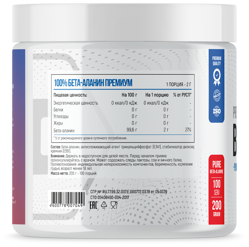 Beta-Alanine - это натуральная добавка, разработанная на основе одноименной аминокислоты. Она изготовлена из высококачественного сырья, прошла несколько степеней очистки и измельчения. В ее формуле нет красителей или ароматизаторов. Именно благодаря такому подходу, добавка хорошо размешивается, быстро абсорбируется и дает ощутимый эффект уже после первого применения.