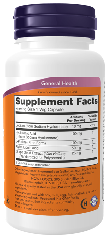 Гиалуроновая кислота-это соединение, которое присутствует во всех тканях организма, причем в наиболее высоких концентрациях оно находится в соединительной ткани (например, коже и хрящах). Гиалуроновая кислота является важной составляющей суставной жидкости, где она служит в качестве смазывающего вещества и обеспечивает сопротивление сжимающим силам. L-пролин, альфа-липоевая кислота и экстракт виноградных косточек были включены для создания более комплексной формулы.