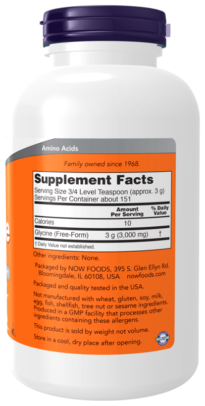 NOW Glycine Pure Powder, Глицин Чистый Порошок, 454 грамма