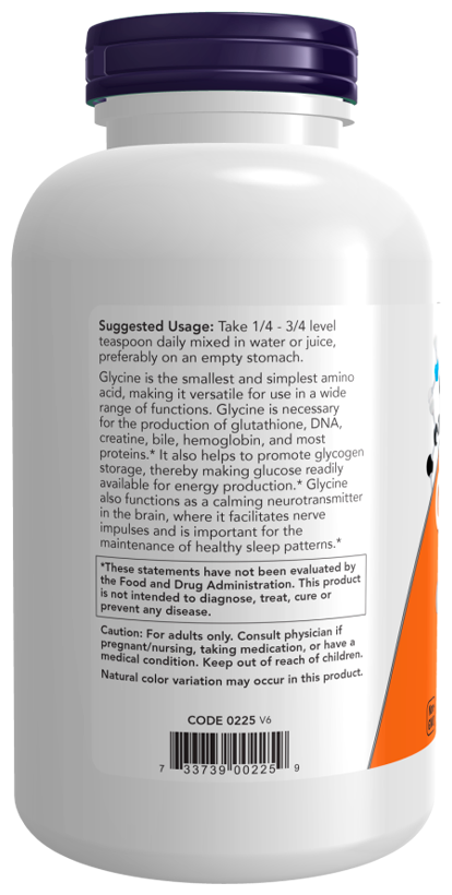 Глицин — это самая маленькая и простая аминокислота, что делает его универсальным для использования в широком спектре функций. Глицин необходим для производства глутатиона, ДНК, креатина, желчи, гемоглобина и большинства белков. Он также способствует накоплению гликогена, тем самым делая глюкозу доступной для выработки энергии.* Глицин также действует как успокаивающий нейромедиатор в головном мозге, где он облегчает передачу нервных импульсов и важен для поддержания здорового режима сна.