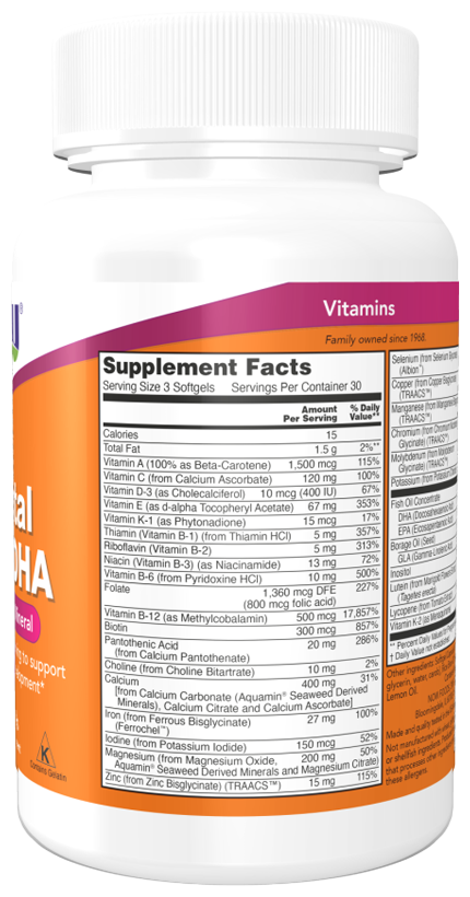 Омега-3 (из концентрата рыбного жира), карбонат кальция (из морских минералов красных водорослей), цитрат и аскорбат кальция, натуральное масло лимона, соевый лецитин, масло бурого риса, пчелиный воск (Е901), оксид магния, магний из морских минералов красных водорослей, цитрат магния, бисглицинат железа, масло из семян бурачника, аскорбиновая кислота, бисглицинат цинка, d-альфа-токоферола ацетат, хлорид калия, d-пантотенат кальция, бисглицинат меди, никотинамид, холина битартрат, инозит, пиридоксина гидрохлорид, бисглицинат марганца, аминохелат хрома, тиамина гидрохлорид, рибофлавин, бета-каротин, фолиевая кислота, аммония молибдат, лютеин, ликопин (из экстракта томатов), биотин, йодид калия, селенометионин, фитоменадион, метилкобаламин, холекальциферол, желатин, глицерин (Е422), вода, камедь рожкового дерева (Е410)